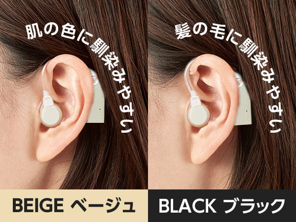あまり集音器を着けていることは目立ちたくないもの。だから、肌になじんで目立ちにくいベージュと髪の毛になじんで目立ちにくいブラックの2色をご用意。